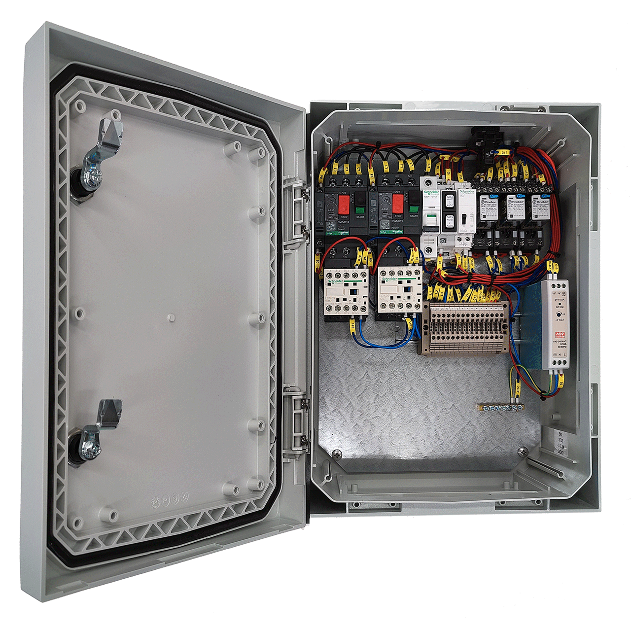 Pump automation for controlling two pumps with level switches. The control is done with level rockers.