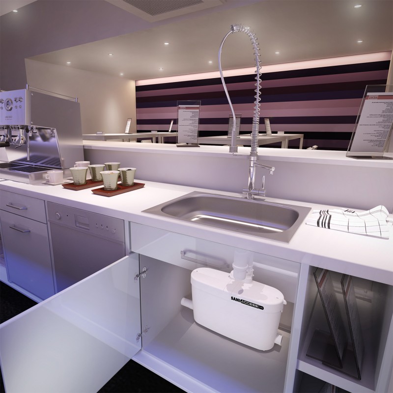 SANIFLO CASE: connecting both a sink and a washing machine to the bathroom drain in a student residence. The home has no sewer connection where the kitchen is installed, but with the help of the SANIACCESS PUMP and 32 mm diameter sewer pipe, the kitchen is ready for use.