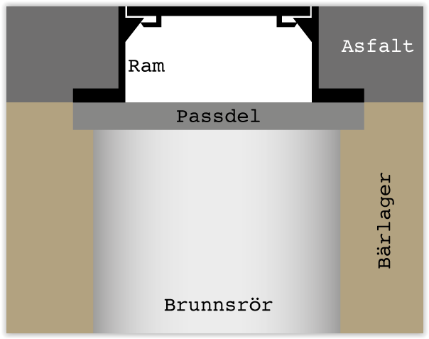 Fasta betäckningar ställes/placeras direkt på brunnen/passdelen. Beläggningen påföres runtom hela betäckningen och packas sedan väl. Vid färdig installation ska betäckningen “ligga” 5-lOmm under övrig befintlig väg.