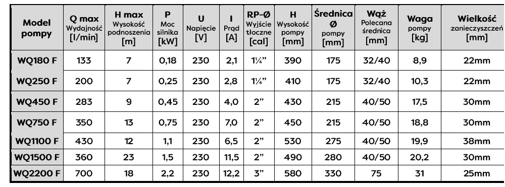 Konstruktionen av WQ 1100F-pumpen är gjord av rostfritt stål och gjutjärn.