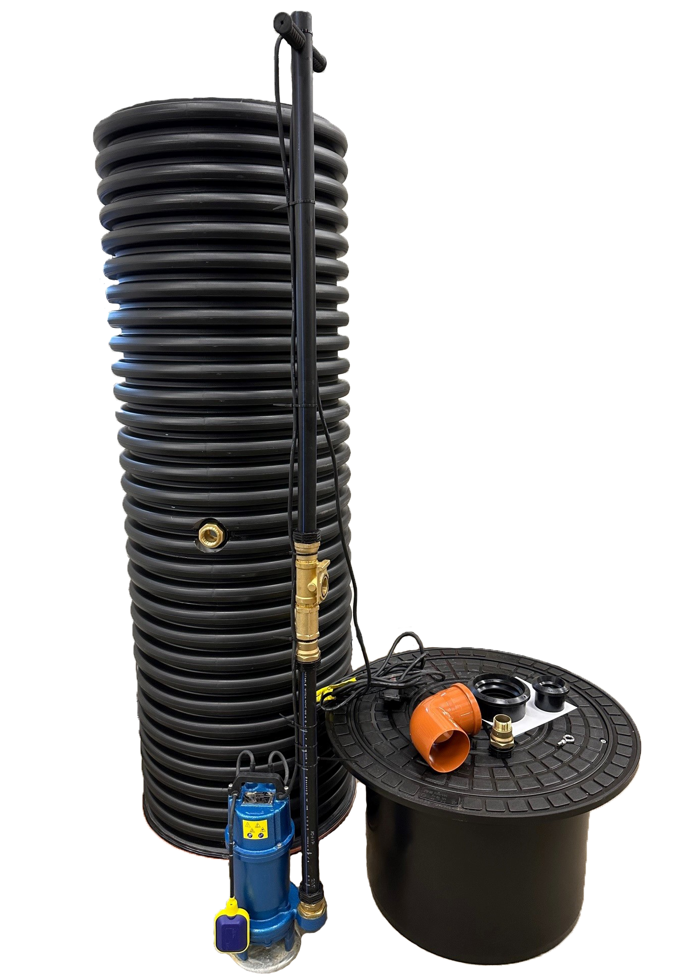 Komplett installationsklar pumpstation med rörsystem inklusive backventil och enkeladapter. Själv rensande sump och larm vid högnivå, överlast, fas fel, spänningsförlust & termostat skydd
