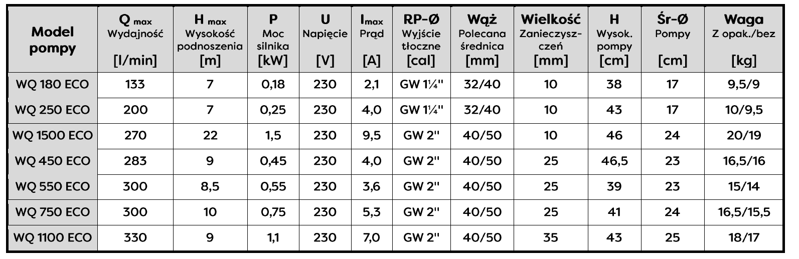 WQ 450 ECO-pumpen är en mycket bra dränkbar pump designad för att pumpa såväl smutsigt vatten som regnvatten och gråvatten som innehåller organiska föroreningar med en maximal diameter som inte överstiger 25 mm.