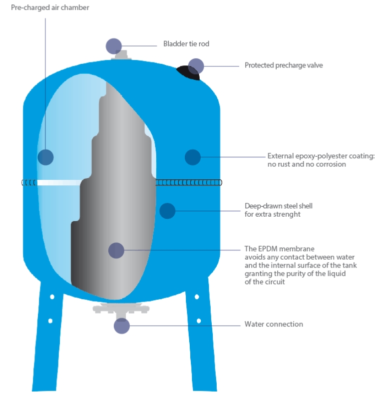 En kvalitets hydropress från AQUASYSTEM som har ett livsmedelsgodkänt membran som separerar vatten och luft inne i behållaren.