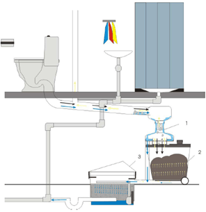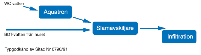 Vattnet spolas till en separator (utan rörliga delar och energiförbrukning) där urin och spolvatten avskiljs från avföring och papper. Därefter ut i ett BDT-slamavskiljare (Bad, Disk, Tvätt) för infiltration i marken.