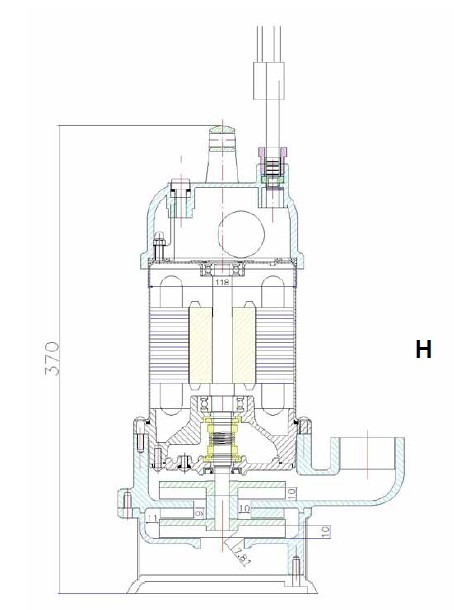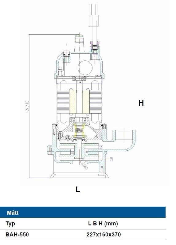 Kraftig dränkbar pump i gjutjärn. Pumpen är fristående. Tryckanslutning, invändigt gängad samt en anslutning för slang.