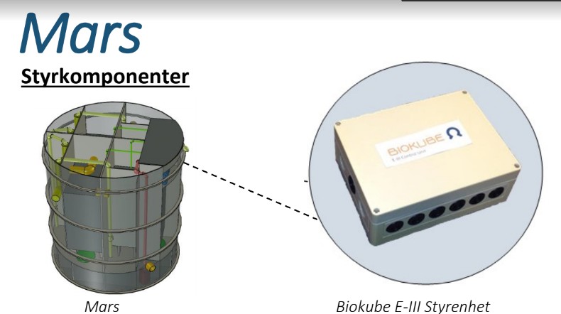 Mars består av två reningskamrar för biologisk rening, en kemikaliebehållare med doseringspump, pumpbrunn med inloppspump, tekniklåda innehållande elektronisk styrenhet och två luftpumpar, larmenhet medföljer.
