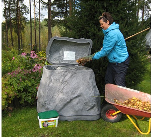 •den låga bygghöjden och det stora locket med gångjärn underlättar underhållet av komposten