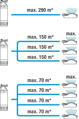 Vill du köra flera vattenspridare på en gång? Inga problem: Med den dränkbara tryckpumpen 6100/5 kan du använda upp till fyra vattenspridare samtidigt, med upp till 6 100 l/h och ett tryck på 4,7 bar. Med den här kapaciteten står sig pumpen väl i förhållande till de flesta färskvattenpumpar. Den automatiska manometerbrytaren sparar både vatten och energi genom att slå på pumpen när vattnet behövs och automatiskt slå av den när inget vatten behövs. Den inbyggda backventilen gör vattnet tillgängligt omedelbart.