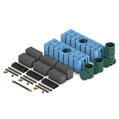 Komplett anläggning för infiltration av WC + BDT-vatten, 3 hushåll (15 personer) normal skyddsnivå. Kan användas där LTAR är minst 10. 10-års funktionsgaranti på hela anläggningen!