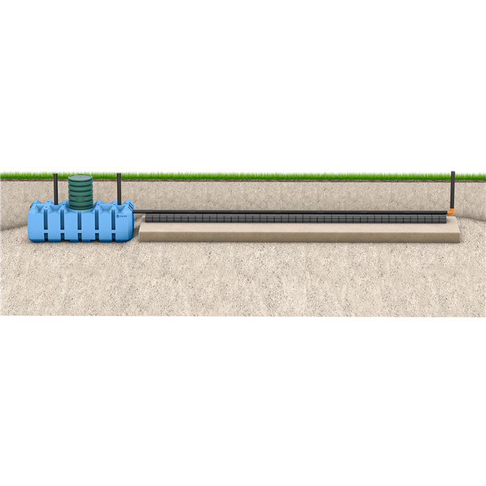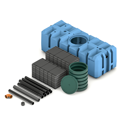 Levereras med 7 st IN-DRÄN moduler vars unika konstruktion gör att infiltrationsytan endast blir ca en tredjedel av storleken på en vanlig infiltration.