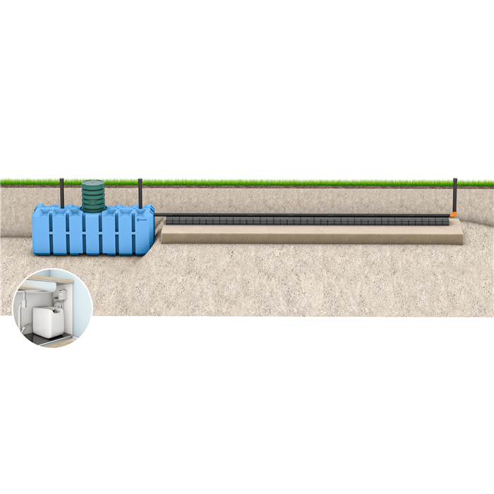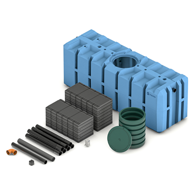 Levereras med 7 st IN-DRÄN moduler vars unika konstruktion gör att infiltrationsytan endast blir ca en tredjedel av storleken på en vanlig infiltration.