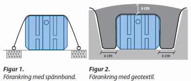 Viktigt att tänka på vid användande av denna metod är att geotextilen ska ha en viss draghållfasthet minst 7 kN/m² eller speciella förankringsdukar om återfyllnad sker med minst 30 cm ovan tank,