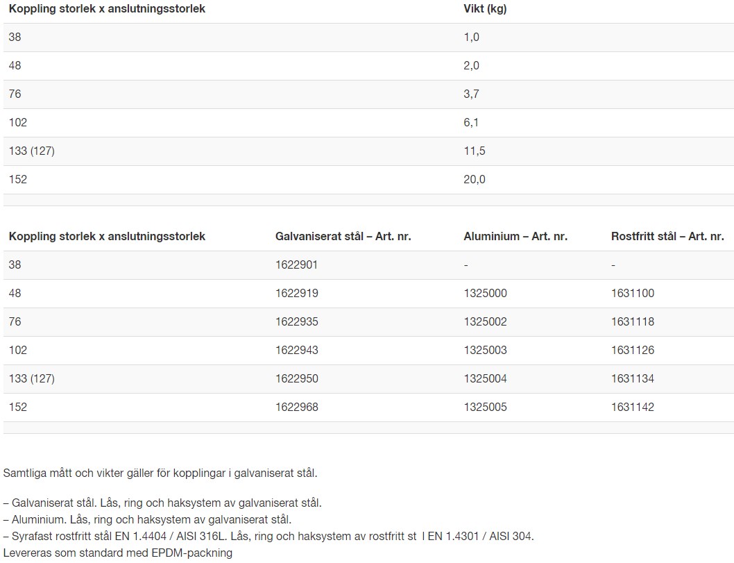 Kopplingarna tillverkas i ett flertal dimensioner och kan fås i galvaniserat stål, rostfritt stål eller aluminium.