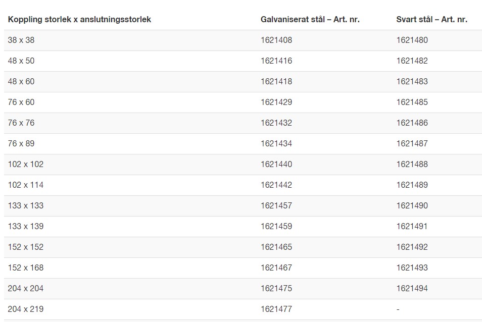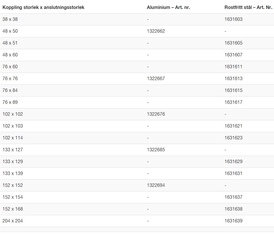 Kopplingarna tillverkas i ett flertal dimensioner och kan fås i galvaniserat stål, rostfritt stål eller aluminium.