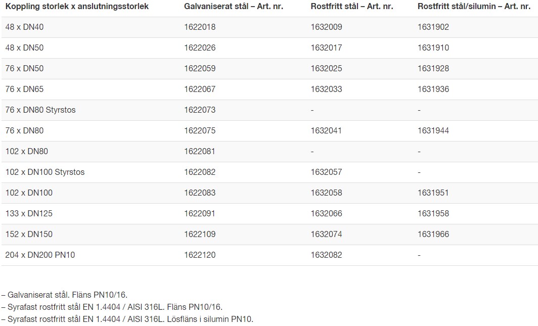 Kopplingarna tillverkas i ett flertal dimensioner och kan fås i galvaniserat stål, rostfritt stål eller aluminium.