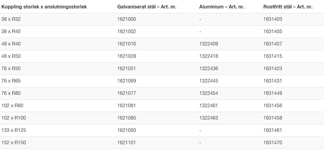 Kopplingarna tillverkas i ett flertal dimensioner och kan fås i galvaniserat stål, rostfritt stål eller aluminium.