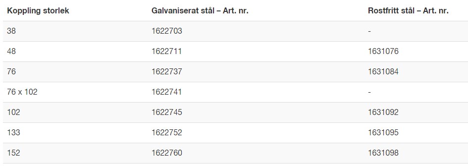 Kopplingarna tillverkas i ett flertal dimensioner och kan fås i galvaniserat stål, rostfritt stål eller aluminium.