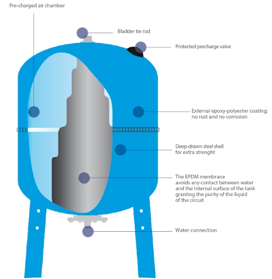 Materialet i blåsan är EPDM som är driksvatten godkänd.