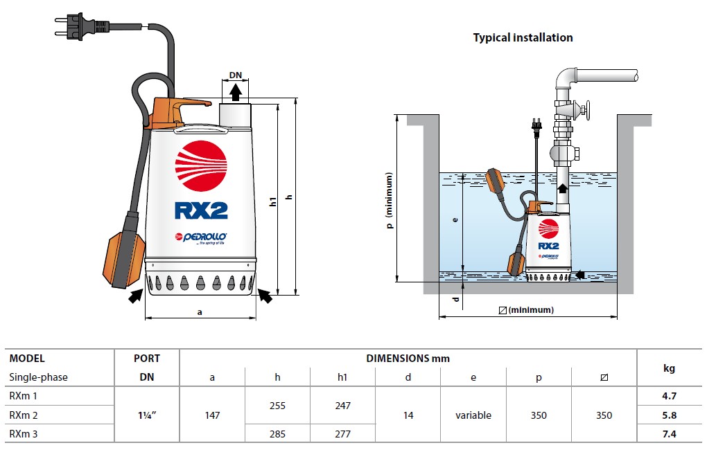 Serie RX rostfria dränkbara länspumpar med centrifugalhjul för att pumpa dagvatten från ett hushåll genom en tryckspillvattenledning.