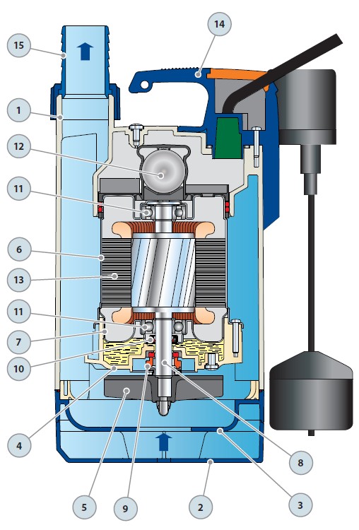 Centrifugalhjulet tillåter flytande partiklar att passera genom pumpen. Pump- och statorhusen är gjorda av komposit material vilket håller vikten nere och är dessutom korrosionsbeständig. Vissa modeller styrs automatiskt av en vertikalflottör som ökar driftsäkerheten eftersom den inte kan hänga sig på andra objekt. Vertikalflottören gör det även möjligt att installera i en mindre pumpgrop.
