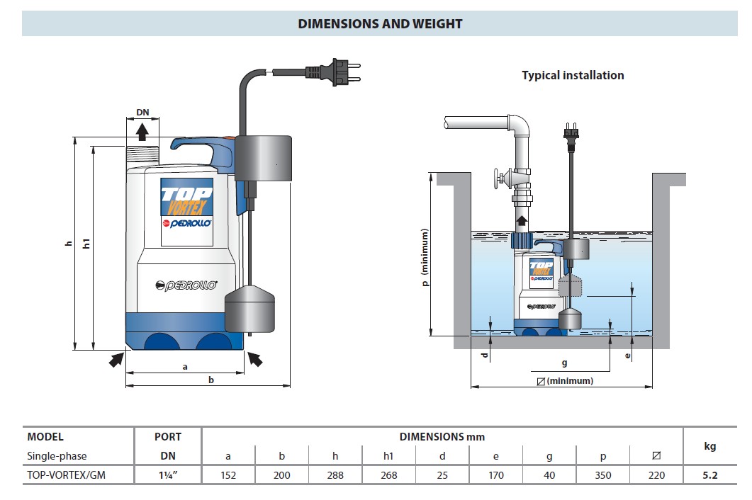 Serie TOP och TOP VORTEX dränkbara länspumpar med centrifugalhjul för att pumpa dagvatten från ett hushåll genom en tryckspillvattenledning.