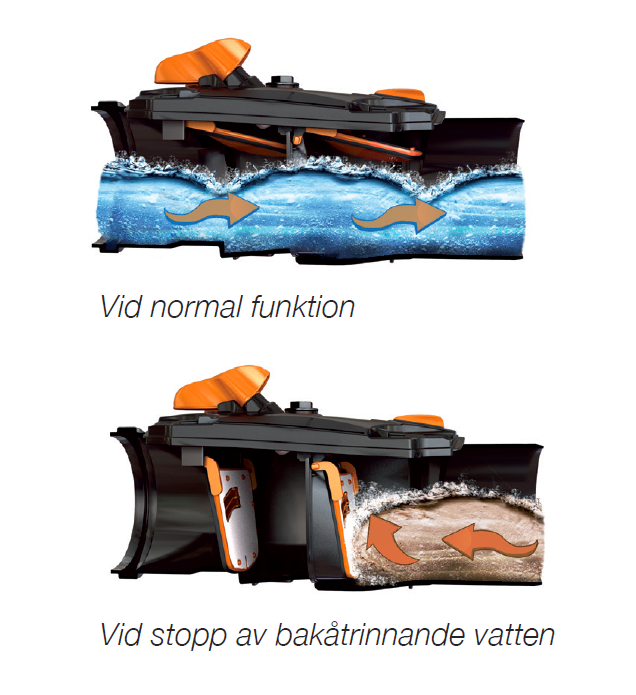 Terana Backventil är en enkel och mycket säker lösning för detta problem. Ventilen, som ser till att avloppsvattnet flyter i endast en riktning, är bland annat utrustad med dubbla skyddsväggar och ger därmed dubbelt skydd mot återflöde. Den kan installeras på rör av alla sorters material och lämpar sig väl för både nybyggnation och installation på befintliga rör i begagnade hus.