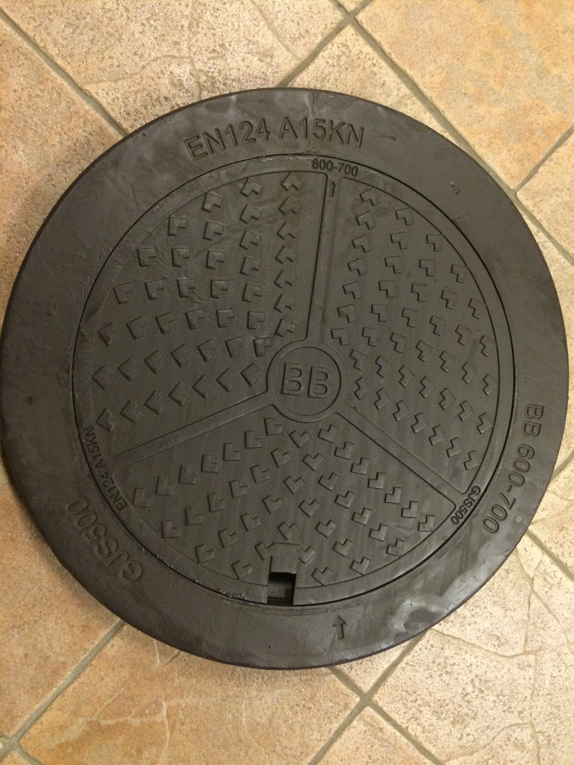 a) Tillverkad i segjärn , vilket gör att den är låsbar och barn säkra och att locken inte spricker .